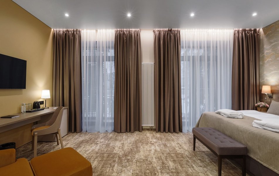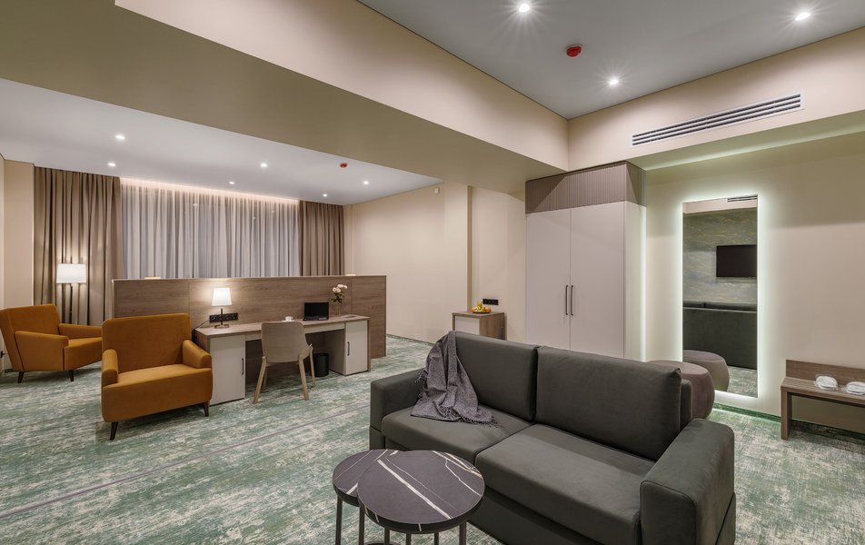 В номере: вешалка, диван, зеркало, кресло, кровать двуспальная, прикроватные тумбочки, стол, шкаф, мини-холодильник, сейф, телевизор ЖК, телефон, чайный набор посуды, электрочайник