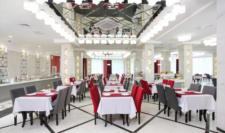 Корпус «Алмаз», ресторан. Залы самообслуживания по системе "шведский стол" на 190 и 160 мест, где порционирование и выдача супов и вторых блюд осуществляется поварами. Обратите внимание, что вынос еды и посуды из обеденного зала не предусмотрен.
