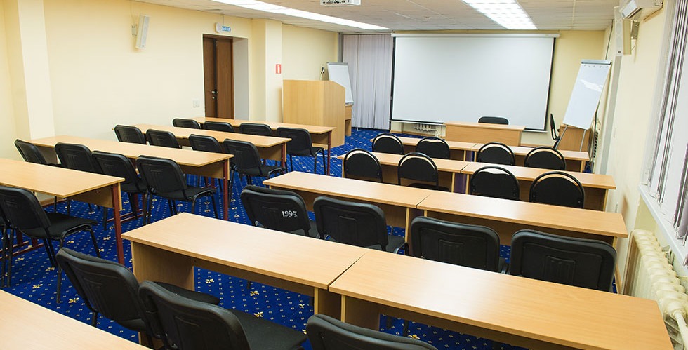 Здесь есть все необходимое оборудование: аудио-акустическая система, микрофоны, экран и проектор, флипчарты.