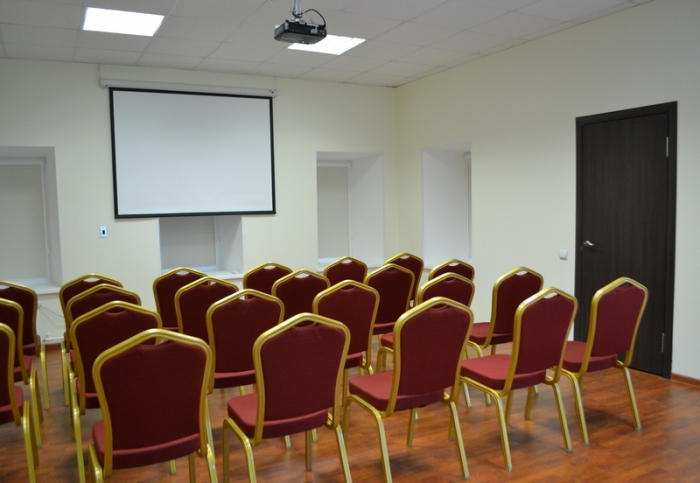 Площадь — 60 м2. Вместимость — до 45 человек. Оснащен мультимедийным проектором, экраном, звуковым оборудованием мощностью 1,2 кВт, микрофонами, модулем докладчика, микшерным пультом с возможностью подключения дополнительных звуковых носителей и обработкой голоса. Вы также можете воспользоваться доской докладчика, ватманом, маркерами и другим инвентарем. Проектор коммутируется как с компьютером, так и с DVD-носителем.