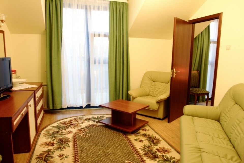 В номере: двуспальная кровать, набор мягкой мебели, стулья, телевизор, холодильник, электрочайник, набор посуды.
