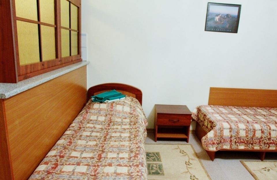 В номере: две односпальные кровати, стулья, кухонная мебель, телевизор, холодильник, электрочайник, набор посуды.