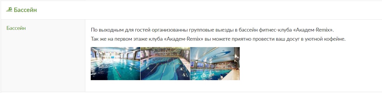 По выходным для наших гостей организованны групповые выезды в бассейн фитнес-клуба «Академ-PEMIX».
