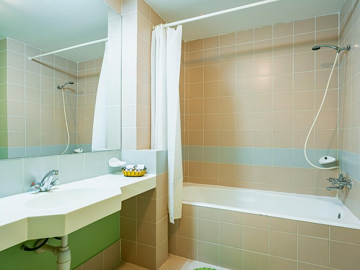 Санузел: ванна, раковина, унитаз, полотенца, тапочки, халаты, банные принадлежности