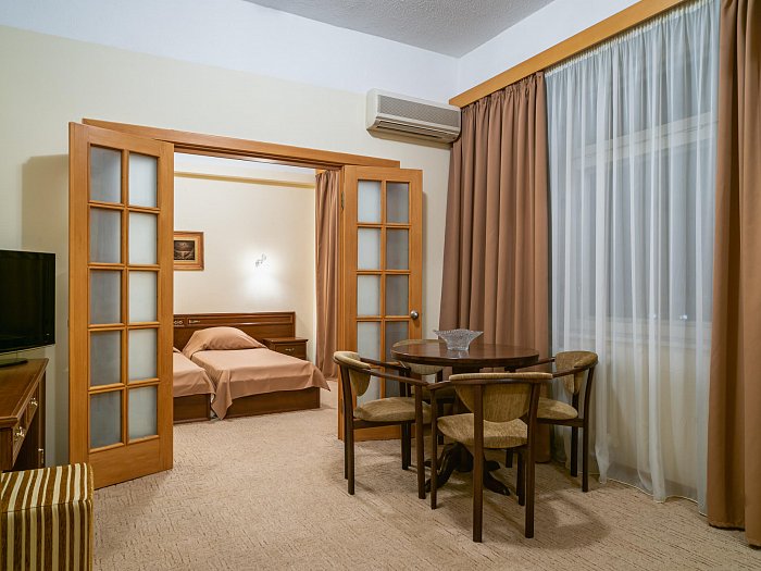 В номере: две комнаты: спальня и гостиная, односпальные кровати или одна двуспальная, прикроватные тумбы, зеркало, шкаф для одежды, мягкая мебель, журнальный стол, сейф, письменный стол, телевизор, кондиционер, фен, холодильник, Wi-Fi