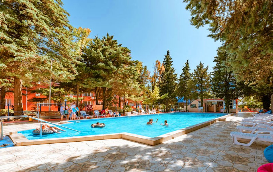 Спорт : открытый взрослый (9*21м) и детский бассейны (6*6м), тренажерный зал, волейбольная площадка, настольный теннис, прокат спортинвентаря, велосипедов, роликов.
