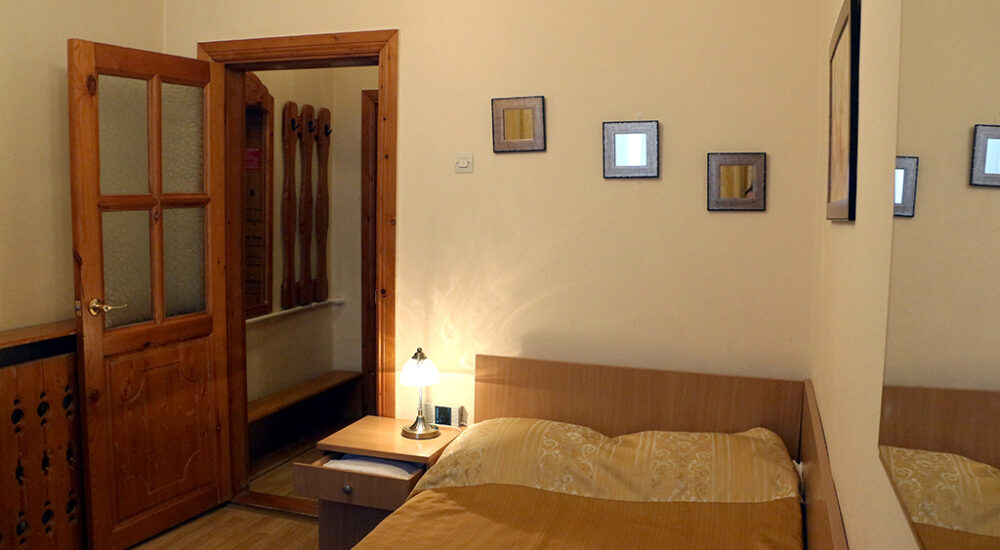 В номере: одна полутороспальная кровать, прикроватная тумбочка, стул, шкаф для одежды, зеркало, вешалка для верхней одежды, холодильник, телевизор, телефон, чайник, чайный набор на одну персону