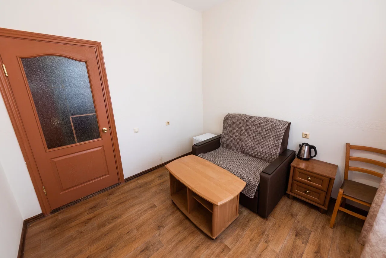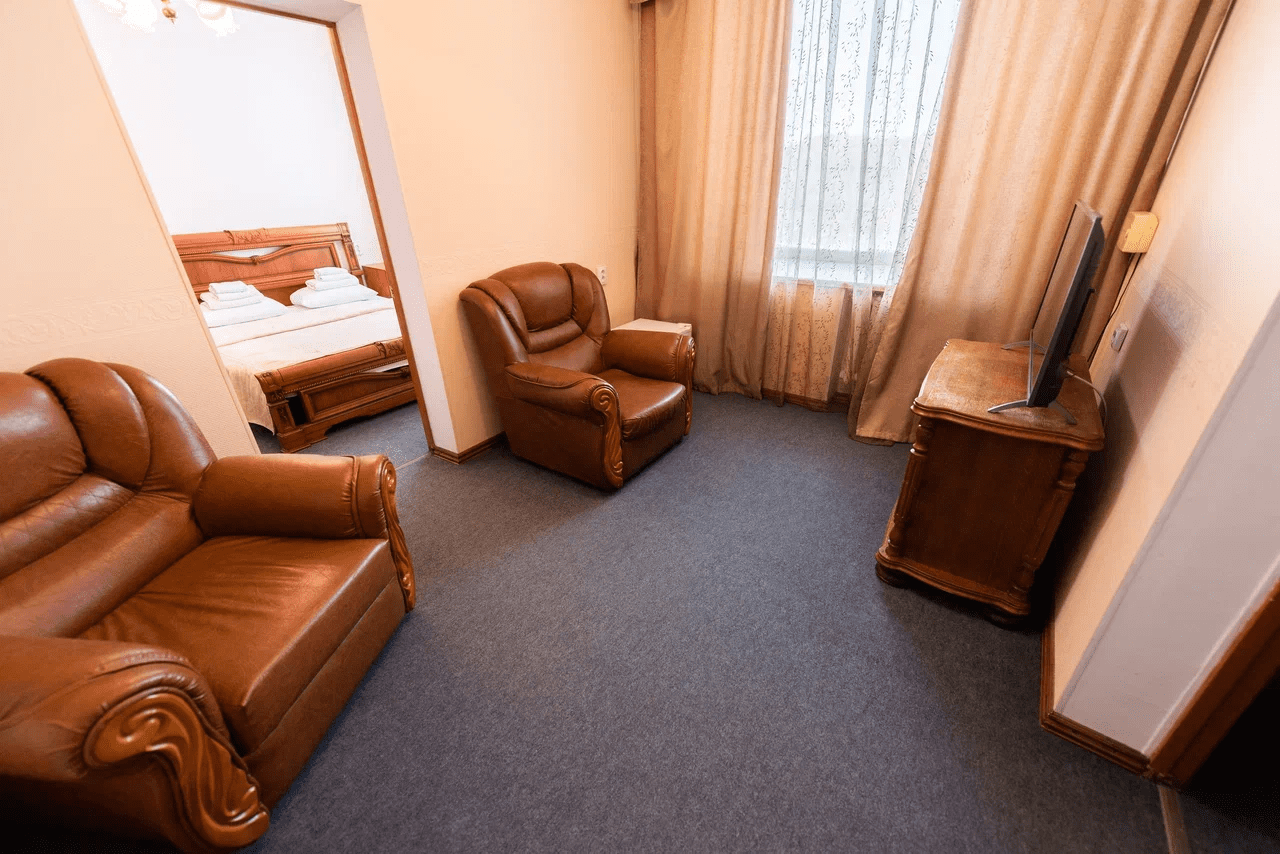 Оснащение номера: две односпальные кровати, прикроватная тумбочка, стол, стулья, шкаф, комод, диван, журнальный стол, телевизор, холодильник, чайный набор посуды, электрочайник
