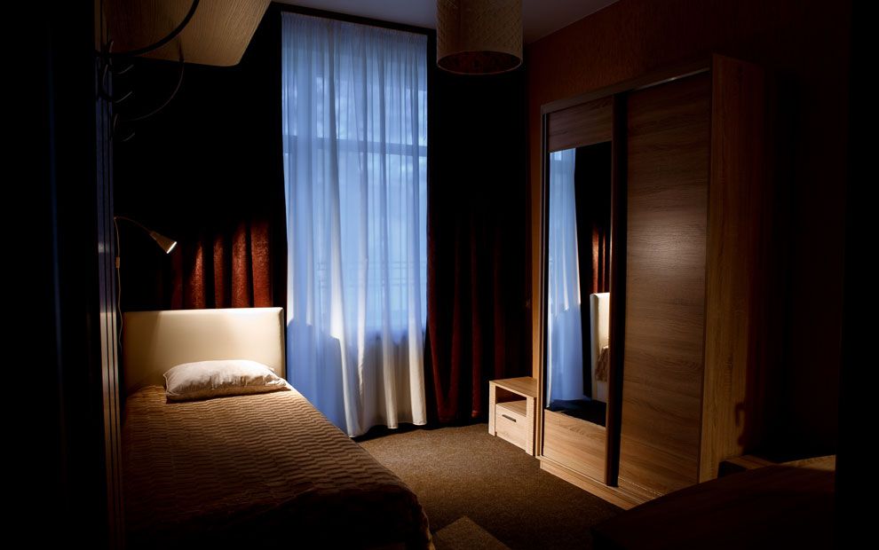 В номере: односпальная кровать, прикроватная тумба, стол, стул, шкаф, телевизор, мини-бар