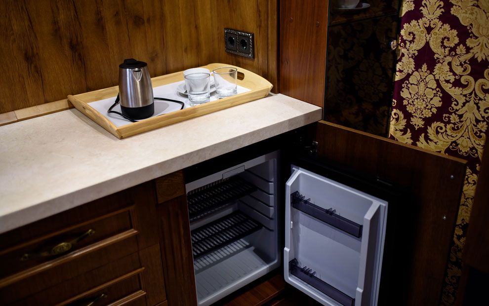 В номере: две полутораспальные кровати или двуспальная, прикроватные тумбы, стол, стулья, шкаф, телевизор, холодильник, чайник, набор посуды